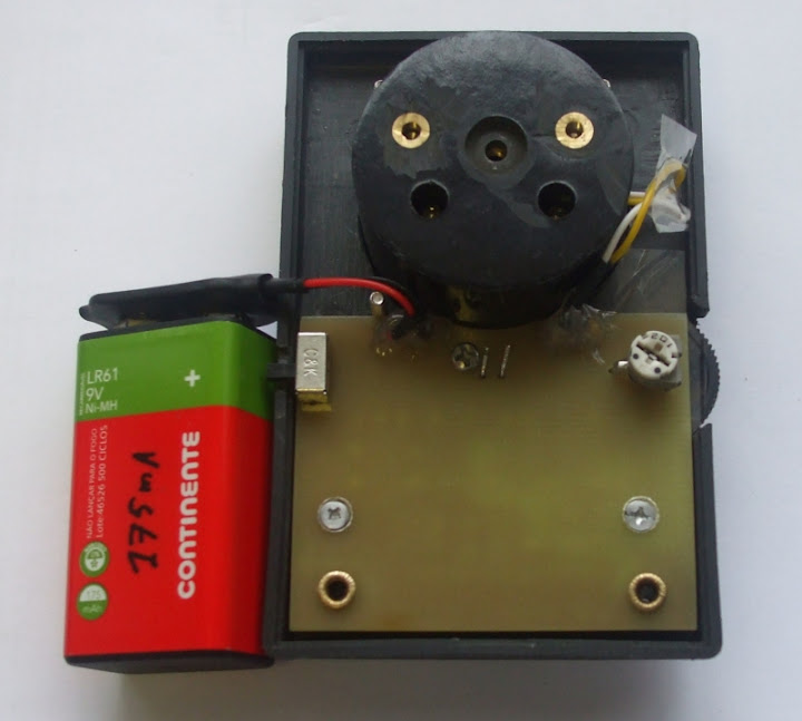 A alimentação é através de uma pilha de 9V, ajustado para 5V com LED a informar o estado da pilha (a original era de 1.5V):